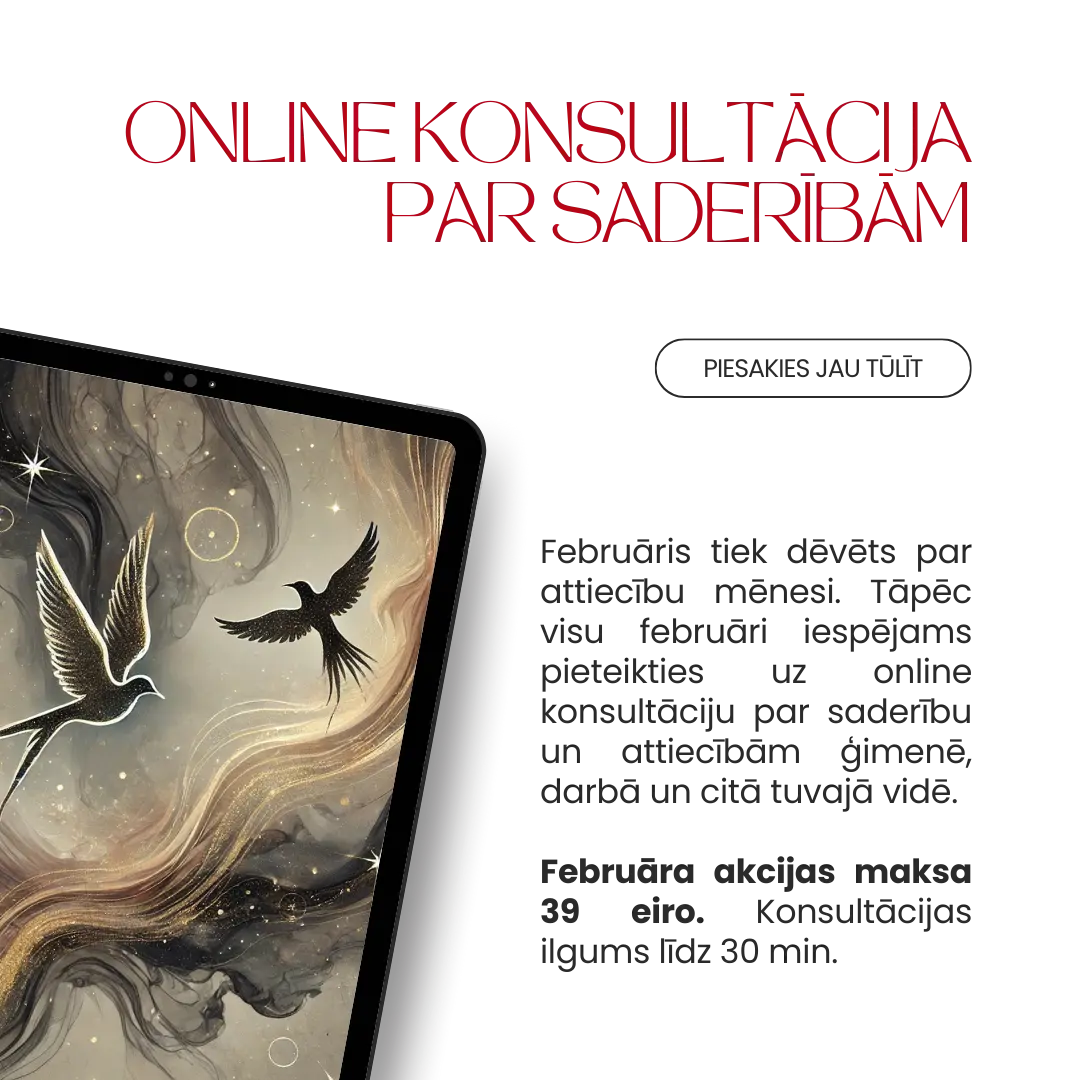 Februāris tiek dēvēts par attiecību mēnesi. Tāpēc visu februāri iespējams pieteikties uz online konsultāciju par saderību un attiecībām ģimenē, darbā un citā tuvajā vidē.
